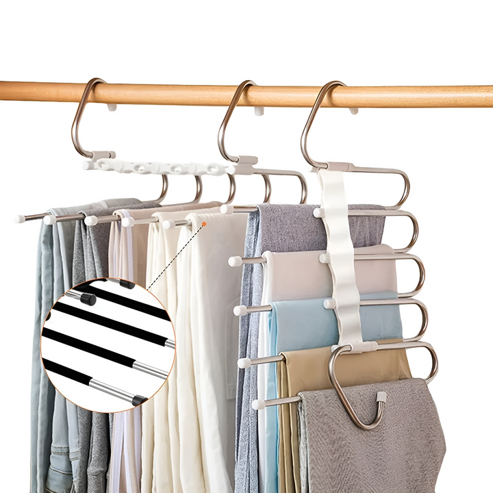 Napaldi™, votre allié quotidien, vous présente le Porte-Pantalons 5 en 1. Transformez le chaos de votre garde-robe en un espace ordonné avec notre solution intelligente.